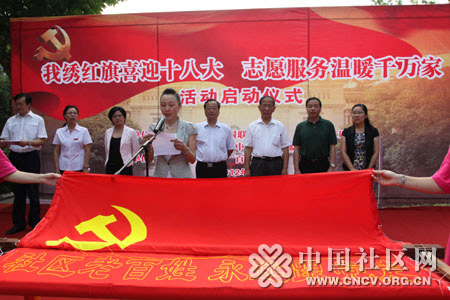 “我绣红旗喜迎十八大 志愿服务温暖千万家”主题活动在我市(社区)隆重举行。通过这次活动,表达了我们爱党爱国爱社区的心声,激发了我们跟党走,为广大社区群众服务的热情。在红旗上每绣一针,都是我们庄严的承诺。在这里,我仅代表社区志愿者向大家发出倡议: