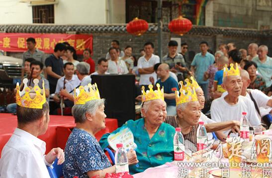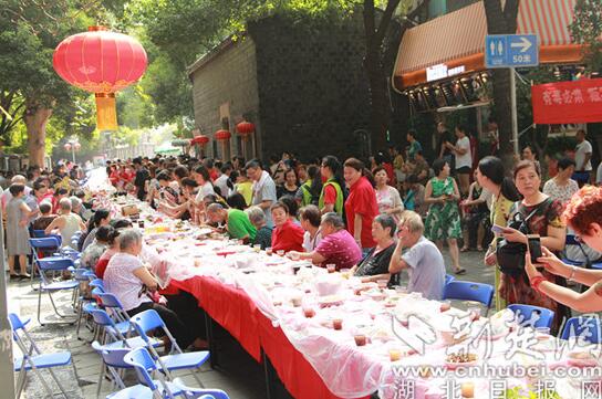 在百米长桌中央的主席台旁,40位高龄老人团坐一桌,他们之中有百岁老人,有当月过生日的老人,还有几位因片区拆迁而搬离的老人这次也受社区邀请,回到昙华林来共赴家宴。其他居民宾客则在主桌两侧流转走动,品尝各式美味佳肴。长桌旁还搭建了戏台,上演着楚剧汉剧为千家宴添彩助兴,居民们喜乐洋洋,和街坊邻居们品菜肴、话家常,欢度中秋、共迎军运。