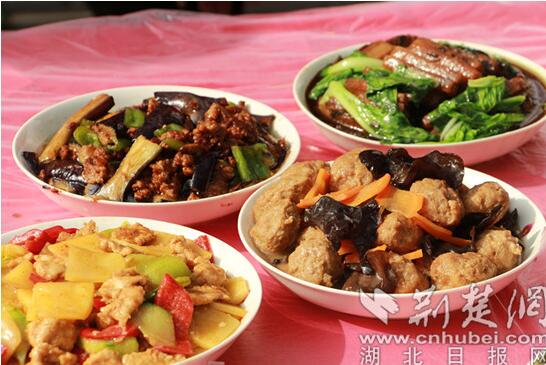 这天上午,昙华林街巷挨家挨户的居民楼里都飘散着浓浓的菜香,大家热情忙碌着,纷纷将自家亲炒的拿手菜端至昙华林主街的长桌上,长桌连绵百米,1000余道各式各样的民间菜肴整齐摆放,其中尤以武昌鱼、沔阳三蒸、排骨藕汤等湖北特色菜以及豆皮、煎包等武汉小吃格外引人注目,街区的商铺们也积极响应,将自家的招牌菜、特色小吃摆上长桌,免费供应,过往行人也纷纷驻足,参与到这场盛宴当中。