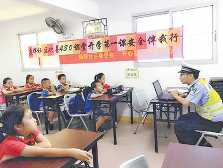开学第一课,“欢喜430课堂”请来交警给孩子上安全课。 记者 何炳进摄