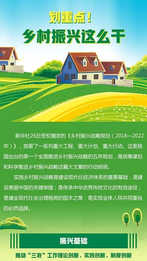 实施乡村振兴战略,是党的十九大作出的重大决策部署。近日,中共中央、国务院印发《乡村振兴战略规划(2018—2022年)》(以下简称《规划》),对实施乡村振兴战略第一个五年工作做出阶段性谋划,部署了一系列重大工程、重大计划、重大行动。重点有哪些?一图带您读懂。