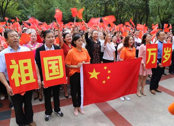 居民们有的围绕国旗,摆成“心”型图案,寓意着祖国永远在我心中;有的组成“百人方阵”,放声欢歌;有的以五角星为底,摆出围绕国旗的造型;更多的居民脸上贴着心形国旗,挥舞着小红旗。