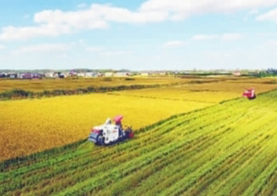 在江苏省盐城市大丰区新丰镇老墩村,收割机在稻田里收获水稻。新华社发