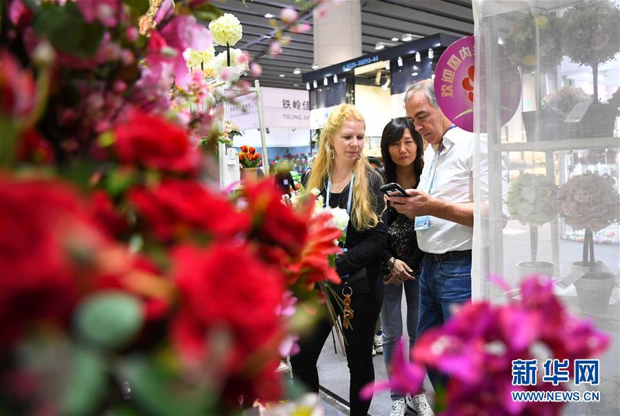 采购商在第124届广交会第二期上洽谈花饰价格(10月23日摄)。