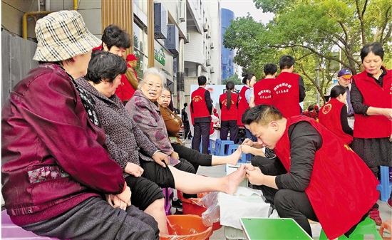 “邻舍+”志愿服务活动现场,志愿者为老人修脚。 嵊州市外宣办供图