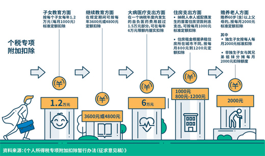 根据《暂行办法》,此次新增的个税专项附加扣除包括六个方面: