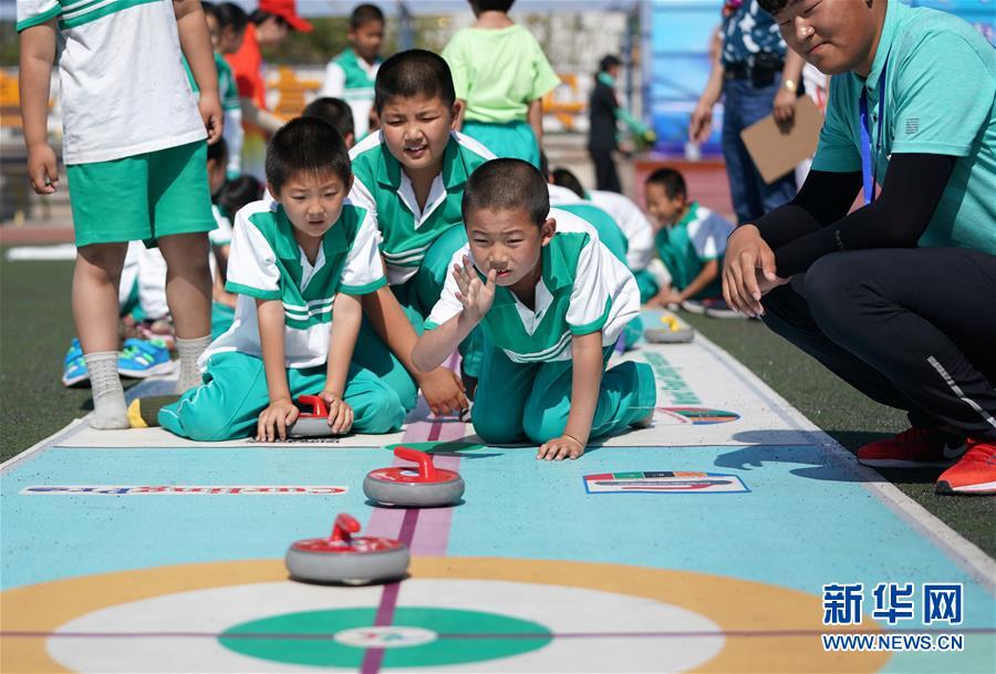 图为2018年6月1日,北京市昌平区十三陵中心小学学生在学校举行的“冰雪嘉年华”活动中体验地板冰壶。 新华社记者鞠焕宗摄