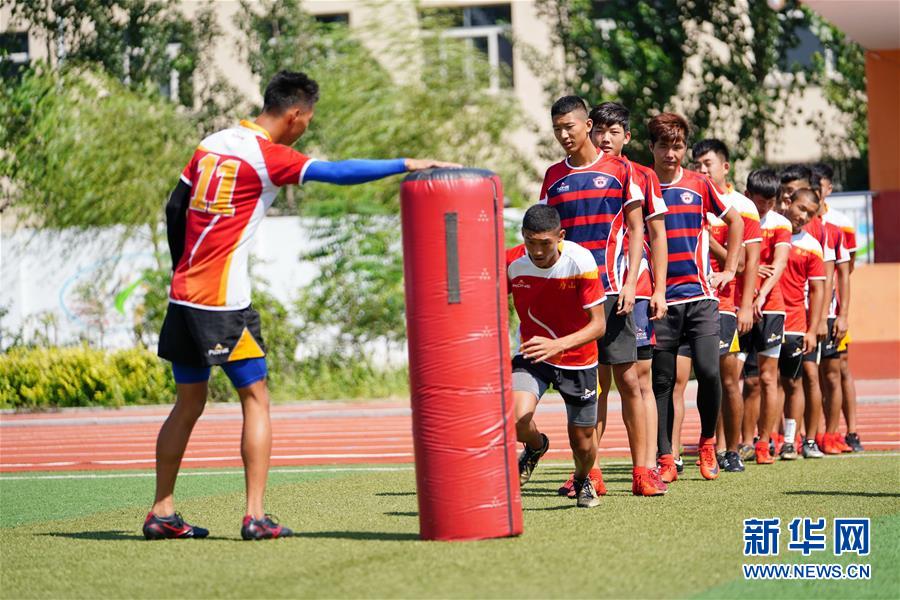 图为2018年8月16日,河北省滦南县胡各庄镇中学英式橄榄球队队员在进行训练。 新华社记者牟宇摄