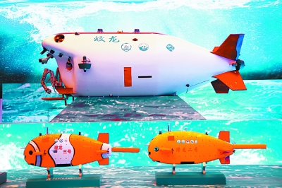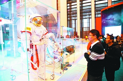 “可上九天揽月,可下五洋捉鳖”。一边是航天技术展区,一边是航海技术展区,完美对应着诗句,一上一下,延展着人类对于世界的认知和想象。天宫二号空间实验室、嫦娥三号月球探测器以及蛟龙、海龙、潜龙“三龙兄弟”深海探测装备模型,让很多在场的孩子发出赞叹之声。