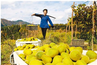 贵州榕江忠诚镇高王村富强合作社罗汉果基地,社员在挑运罗汉果。该村以“党支部+合作社+贫困户”模式,引进无籽罗汉果种苗种植120亩,带动贫困户62户186人增收。 李长华摄(影像中国)