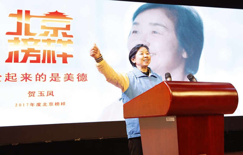 会上,刚刚被中宣部授予“时代楷模”的“北京榜样”优秀群体代表,“2017北京榜样”环保奶奶贺玉凤,以《捡起来的是美德》为题,讲述了她作为一个普通农民,23年如一日,在延庆妫河两岸义务捡拾垃圾,用一份守护家乡绿水青山的坚定信念,从“垃圾奶奶”变成“环保奶奶”,带动更多的人加入环保志愿者队伍的故事。