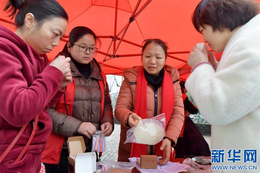 3月5日,在江西省南昌市红谷滩新区凤凰洲志愿服务集散中心,志愿者向社区居民介绍环保口红、肥皂等生活用品的制作方法。新华社记者 彭昭之 摄
