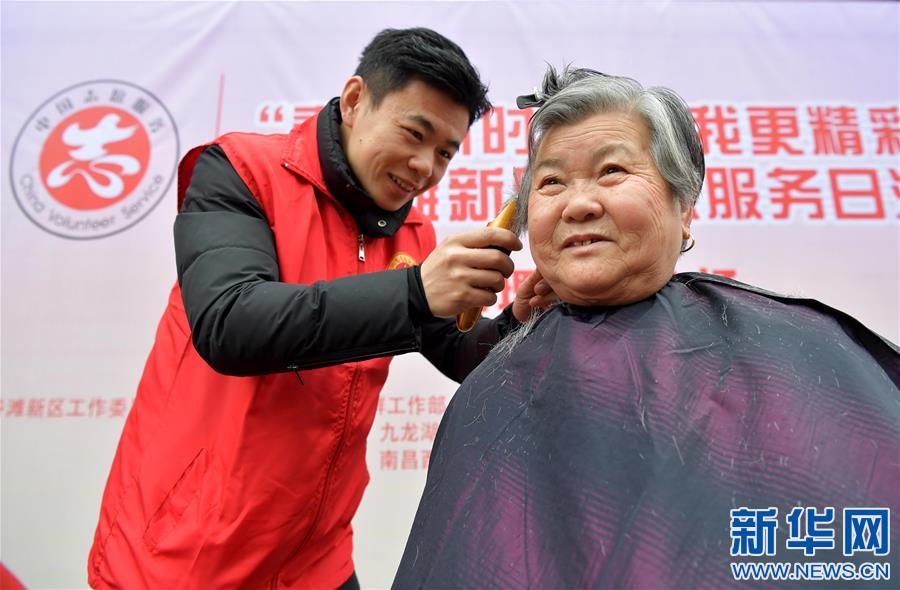 3月5日,在江西省南昌市红谷滩新区凤凰洲志愿服务集散中心,志愿者为社区居民义务理发。新华社记者 彭昭之 摄