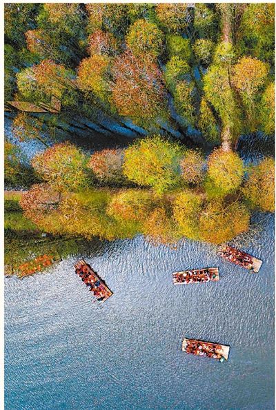 图为4月7日游客乘船在江苏泰州兴化李中水上森林公园内游玩。 汤德宏 周社根摄影报道(影像中国)