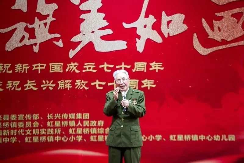 虹星桥镇观音村文化大礼堂特别热闹。非遗表演《龙腾狮跃》,武术操《少年英雄》、警棍盾牌操《保家卫国》、大合唱《我和我的祖国》等精彩的活动庆祝长兴解放;革命先辈的后人和老兵也来到现场,为现场学生讲述当年战争年代的故事。