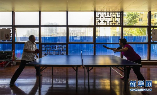5月23日,河北省衡水市桃城区中华大街街道育新社区老人在日间照料中心打兵乓球。 近年来,河北省衡水市桃城区以社区建设为依托,积极整合辖区资源,根据老年人精神文化生活需求逐步完善社区养老服务设施,并通过定期开展丰富多彩的社区活动,让社区老人乐享幸福生活。 新华社记者李晓果摄