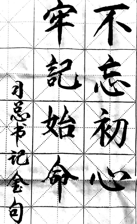 (冷老师现场挥毫,写下“不忘初心 牢记使命”)