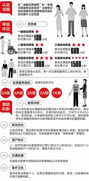 在随后的激励中,成都将志愿者分为五个星级:参加志愿服务时长累计达100小时的,评为“一星级志愿者”;参加志愿服务时长累计达300小时的,评为“二星级志愿者”;参加志愿服务时长累计达600小时的,评为“三星级志愿者”;参加志愿服务时长累计达1000小时的,评为“四星级志愿者”;参加志愿服务时长累计达到1500小时的,评为“五星级志愿者”。