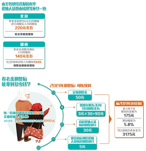 比如,北京市人力资源和社会保障局发布的调整方案显示,养老金按照5%左右的增幅进行调整后,人均增加220元左右,较去年略有增加;湖南省公布的退休人员养老金调整方案显示,养老金调整后,人均月增加金额为140元左右,比2018年的月人均增加134元,调整金额略有增加;宁夏决定从2019年1月1日起调整全区企业和机关事业单位退休人员基本养老金,其中企业提高比例为5.5%,机关事业单位提高比例为4%,预计全区共有63.67万人受益。