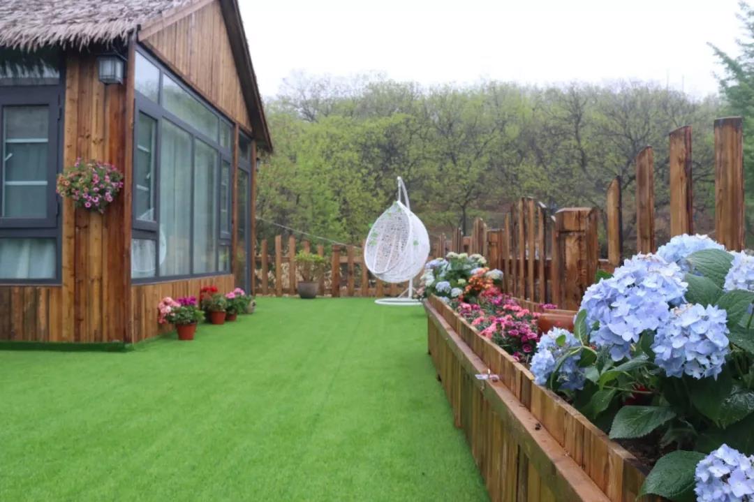 屋内中央空调、地暖等现代化设施一应俱全,院内青石、草地、百合花构成的私家花园以及防腐木铺设的观景露台,让人仿佛穿越到了世外桃源。