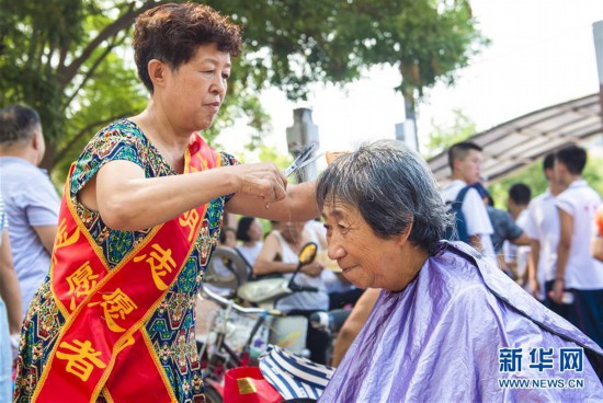 7月28日,在河北省衡水市桃城区河西街道,志愿者为居民免费理发。 今年以来,河北省衡水市桃城区围绕创建文明城市这个落脚点,全区各机关企事业单位党员干部、社会组织志愿者近万人,走上街头、走进小区开展特色化、常态化志愿服务活动,让城市更靓丽,让百姓更幸福。 新华社记者李晓果摄