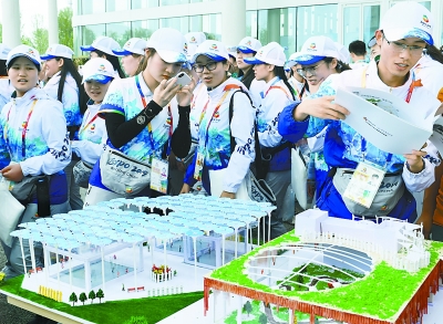 日前,2019北京世园会园区志愿者上岗交接仪式在国际馆前广场举行,来自北京建筑大学的志愿者将自己亲手制作的园区场馆建筑模型和手绘图集捐赠给世园会。