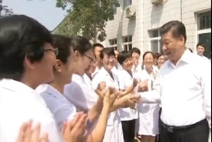 △2016年7月28日,习近平到河北省唐山市考察。这是他离开唐山市截瘫疗养院时,与医护人员握手。