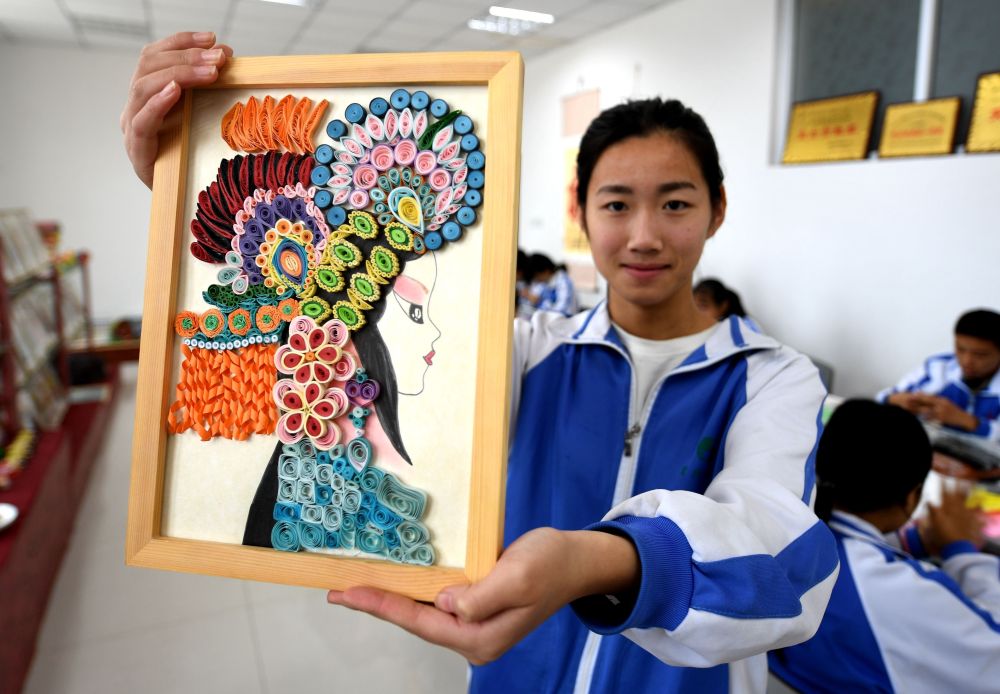 2018年11月16日,河北衡水冀州职教中心学生展示制作的衍纸作品。