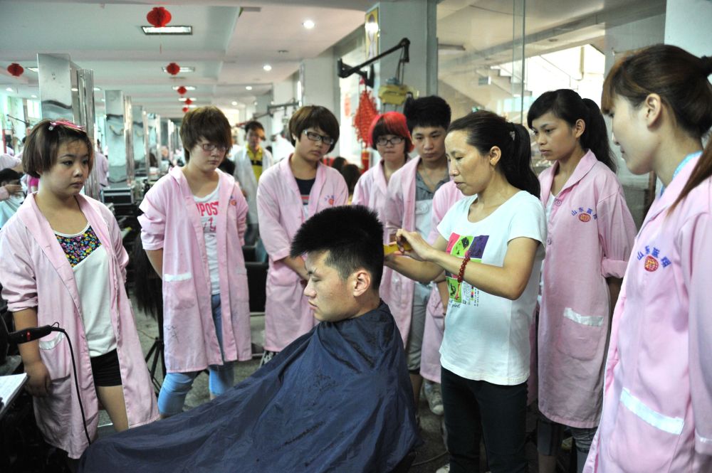 2014年6月23日,山东蓝翔高级技工学校美容美发专业的学生在观看老师的教学示范。