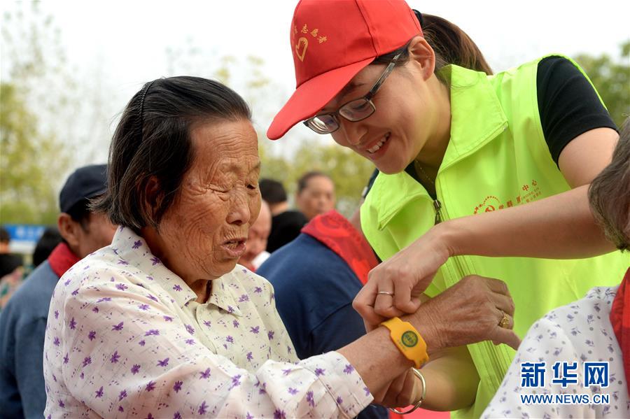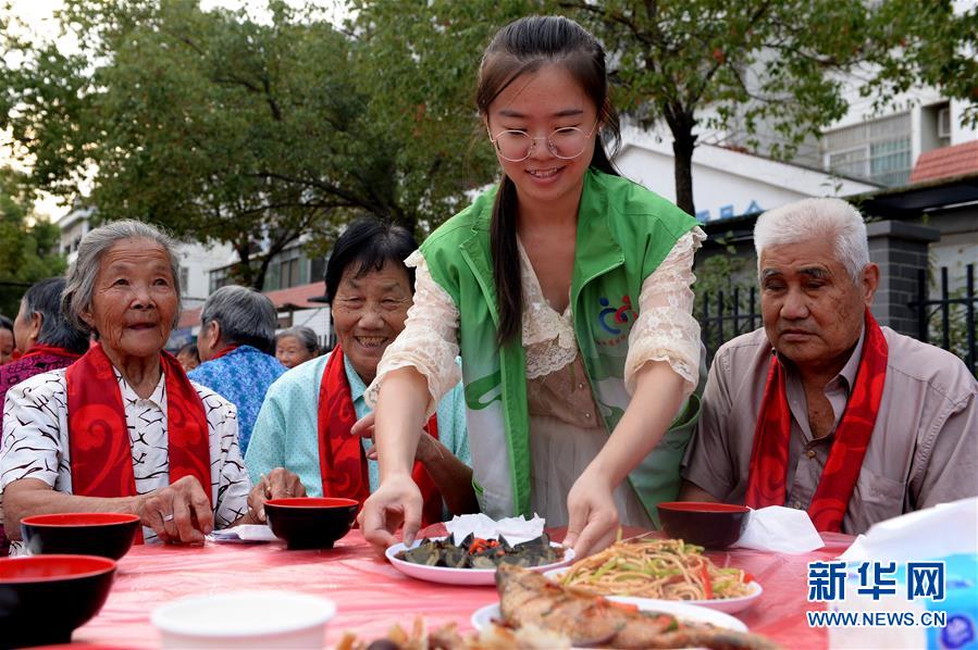 9月24日,安徽省合肥市锦绣社区举办敬老宴,邀请社区内的高龄老人共聚一堂,并请志愿者向老人宣传“黄手环”,防止老人走失。 新华社发(黄博涵摄)