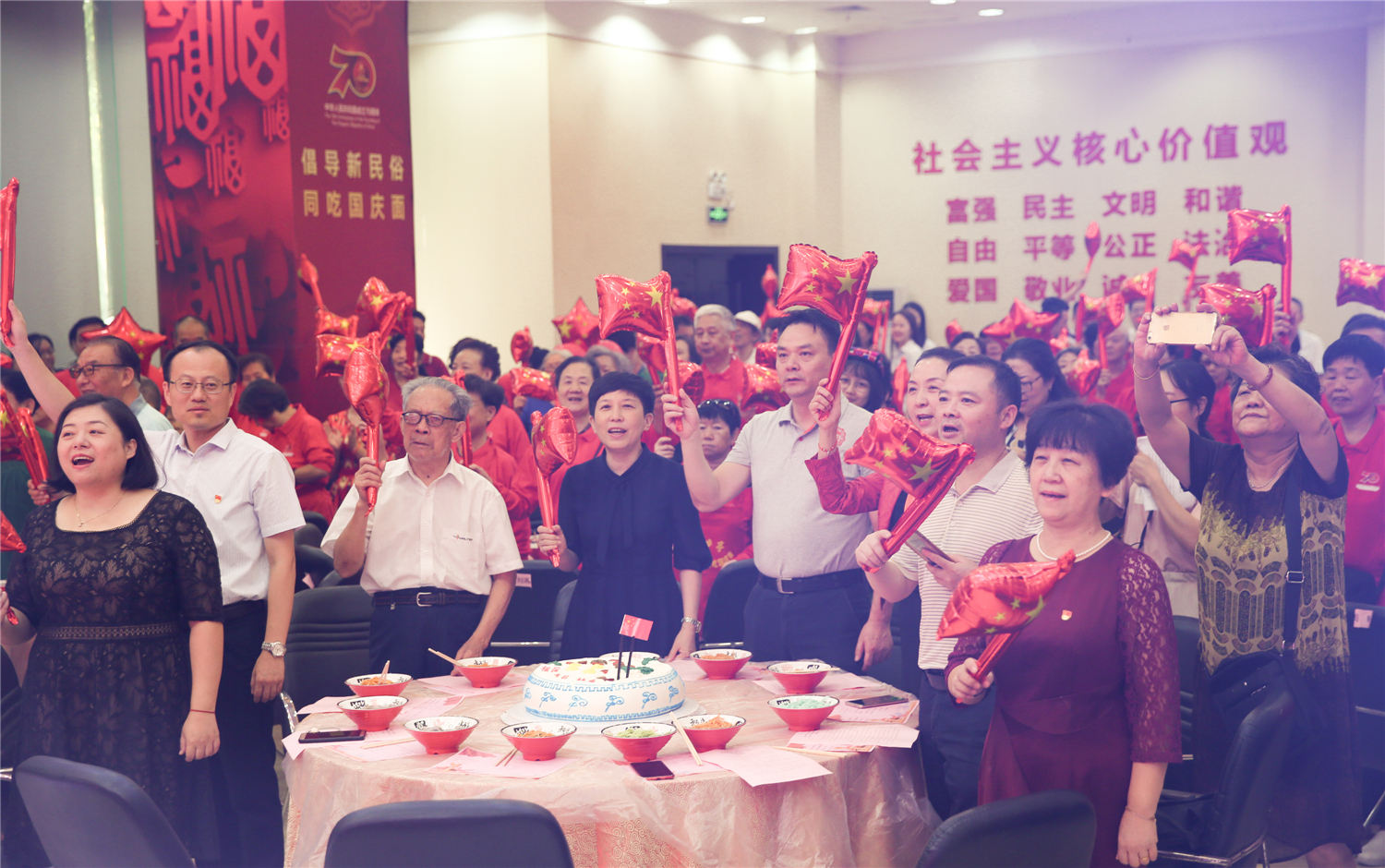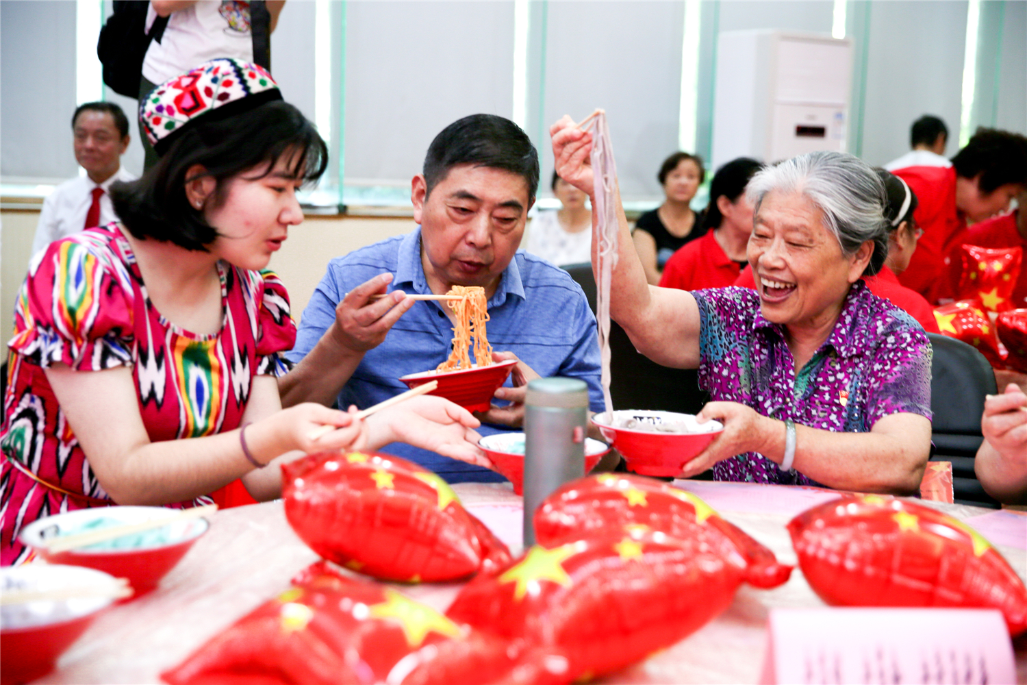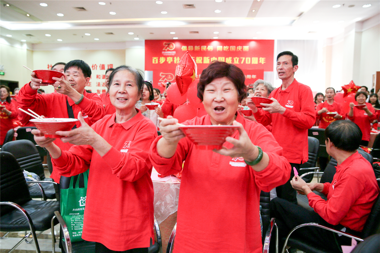 今日下午,在湖北武汉江岸区百步亭社区,由70位与新中国同龄老人发起的“倡导新民俗 同吃国庆面”活动在社区党群中心举行。社区老党员、优秀志愿者、各族居民代表等共2000余人,欢聚一堂,同做长寿面,同吃国庆面,分享“我与祖国同成长”故事,畅谈祖国发展变化和社区老百姓的幸福生活,载歌载舞共同庆祝新中国成立70周年。
