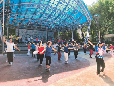 柔力球项目志愿者在北京市海淀区曙光文化广场指导社区居民练习。 李和君摄