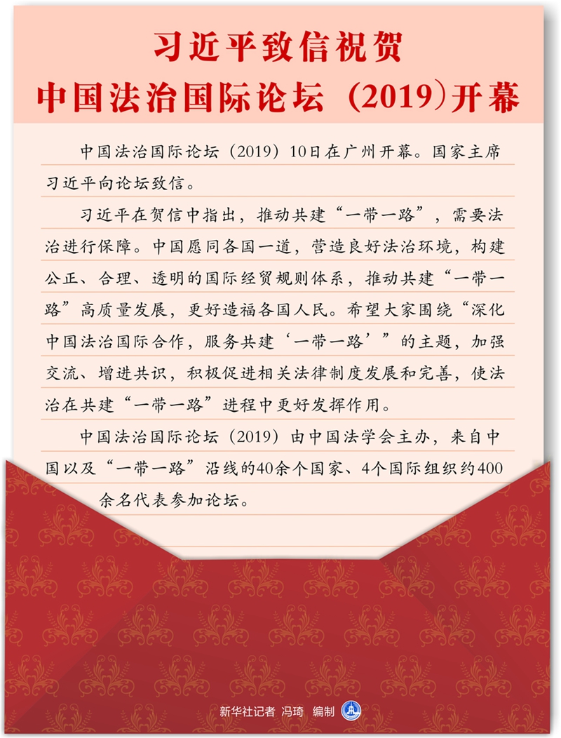 图表:习近平致信祝贺中国法治国际论坛(2019)开幕 新华社记者 冯琦 编制。