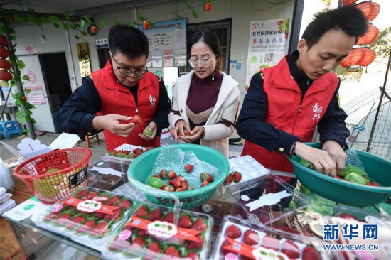 12月3日,长兴县画溪街道综合行政执法中队的志愿者在草莓产业帮扶基地帮助分拣草莓。 国际志愿者日即将到来,浙江省长兴县开展“志愿服务进田间”活动,全县各类社会志愿服务组织及各级部门党员志愿者积极走村入户,参与乡村志愿服务。 (记者 徐昱 摄)