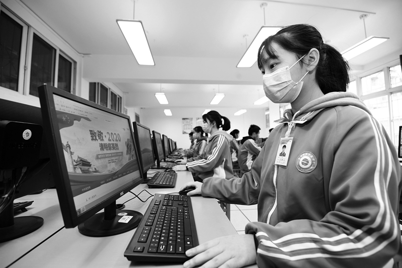 贵阳市第十五中学初三学生通过“云祭扫”向革命先烈献花寄语。 赵松摄