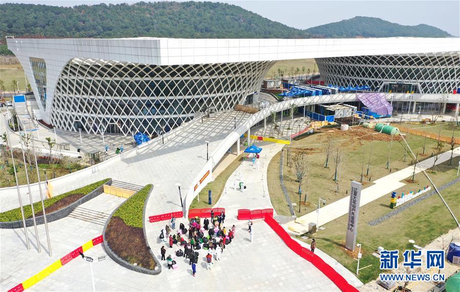 3月10日,武汉所有方舱医院全部休舱。这是在位于武汉市江夏大花山户外运动中心的江夏方舱医院,新冠肺炎治愈患者等待上大巴(无人机照片)。 新华社记者 才扬 摄