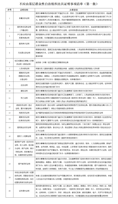 意见明确,基层群众性自治组织出具证明的事项,必须是有明确法律法规依据或经国务院批准列入保留证明事项清单、属于基层群众性自治组织职责范围的事项。各地区要在与证明事项清理工作已有政策措施衔接基础上,制定基层群众性自治组织出具证明事项清单。凡是没有法律法规依据或未经国务院批准列入保留证明事项清单的证明事项,基层群众性自治组织不予出具。对虽有法律法规依据但已经不符合当前经济社会发展实际的或基层群众性自治组织没有能力核实的,有关部门要在广泛征求意见、充分调研论证的基础上按程序提请修改法律法规规定,明确基层群众性自治组织不再出具。