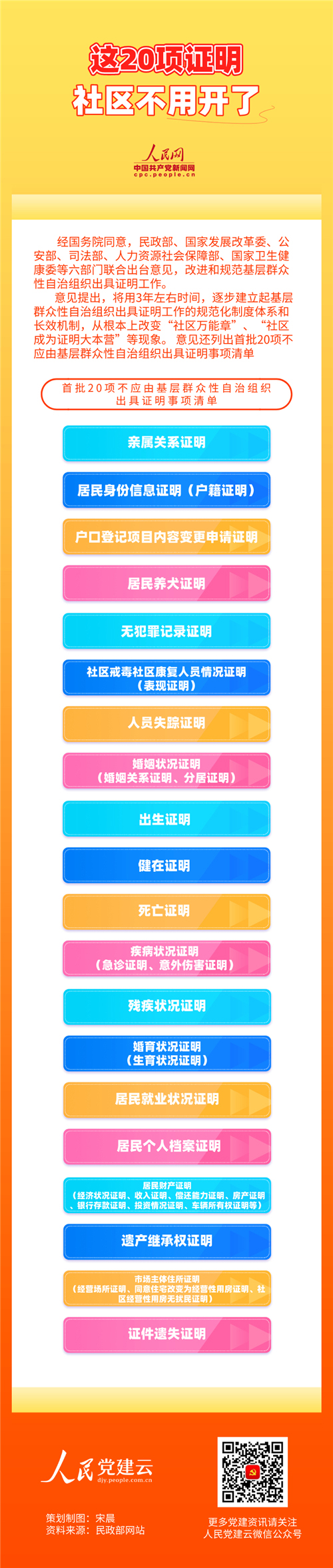 另外,意见还列出首批20项不应由基层群众性自治组织出具证明事项清单,包括亲属关系证明、居民身份信息证明、户口登记项目内容变更申请证明、居民养犬证明、无犯罪记录证明、社区戒毒社区康复人员情况证明(表现证明)、人员失踪证明、婚姻状况证明、出生证明、健在证明、死亡证明、疾病状况证明 、残疾状况证明、婚育状况证明、居民就业状况证明、居民个人档案证明、居民财产证明、遗产继承权证明、市场主体住所证明、证件遗失证明。(央视新闻客户端)