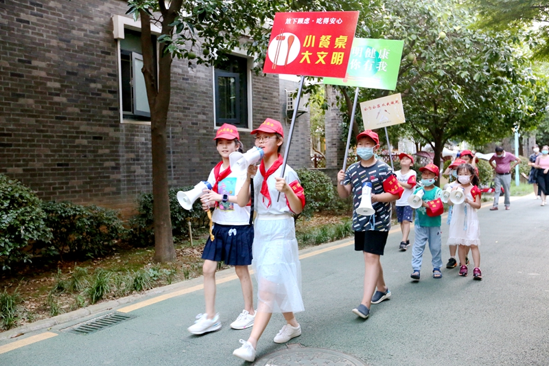 “我们不仅自己做到不剩饭不剩菜,还要用手中的小喇叭,用快板、小曲在苑区、楼栋将节约理念‘唱’进小朋友心里。”付韩钰说道。