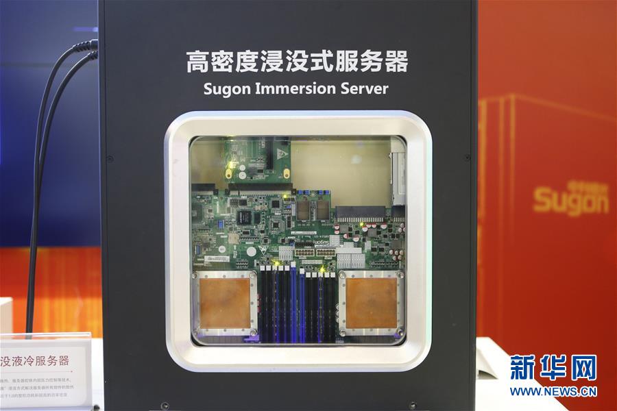 这是10月30日在北京中科曙光展厅拍摄的高密度浸没式服务器。 新华社记者 丁洪法 摄