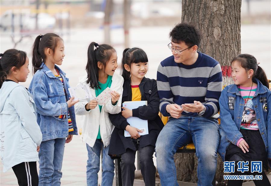 北京市中关村第三小学雄安校区驻派教师冯小宇在雄安校区同孩子们交流(2019年3月20日摄)。 新华社发