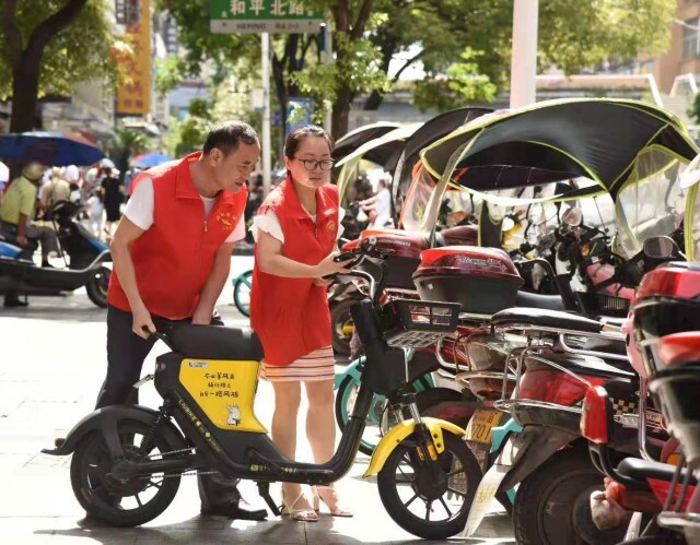 人民路社区“衡阳群众”正在整理共享乱停的共享单车。图片来源:新湖南客户端