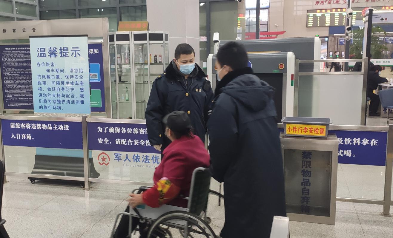耄耋之年的老人独自搭乘2月5日12:08荆州-昆山D2214次列车,行李沉重、腿脚不便,市财政局系统产业基金管理公司志愿者曾东、文明荆州志愿者曹魏龙一路护送老人进站,并完成了与荆州站的爱心接力,护老顺利登车。