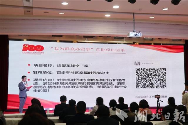 推动党员进一步为老百姓办实事 活动现场,百步亭社区各党总支和职能部门党支部发布“我为群众办实事”首批项目清单,包含“春风化雨育绿植 下沉党员践行动”“红色拍档——爱心接力 助残护学”“情暖空巢、帮困解忧”“我为爱车找个‘家’”等项目。这些项目是在征集居民微心愿基础上产生,由百步亭社区各党总支、职能部门党支部推进落实。每个项目建有微信群,居民可以扫码进群,进一步了解“我为群众办实事”项目办理进展。