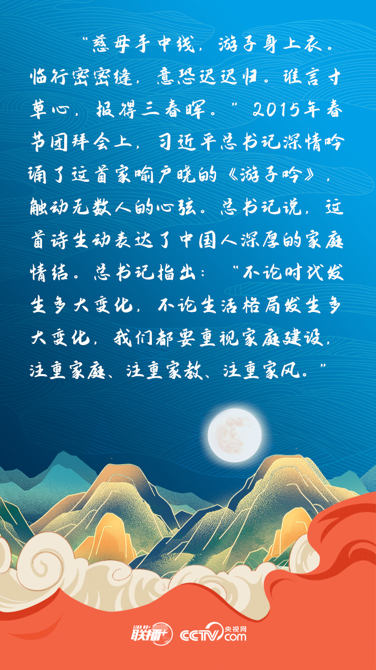 家是最小国,国是千万家。党的十八大以来,习近平总书记多次强调要重视家庭建设,提倡把爱家和爱国统一起来,把实现个人梦、家庭梦融入国家梦、民族梦之中。中秋佳节即将到来之际,央视网《联播+》栏目为您撷取总书记阐释家国情怀的小故事,与您一起感受总书记心中的家国情。