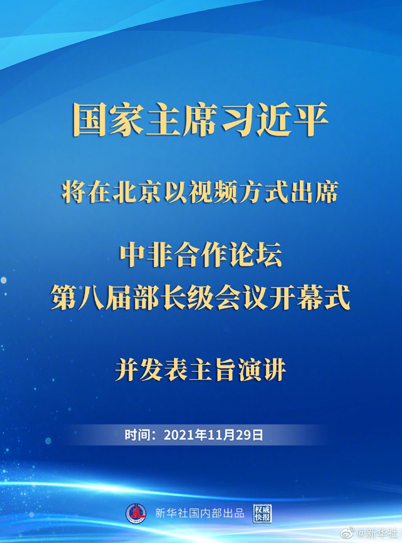 外交部发言人华春莹11月26日宣布:国家主席习近平将于11月29日在北京以视频方式出席中非合作论坛第八届部长级会议开幕式并发表主旨演讲。