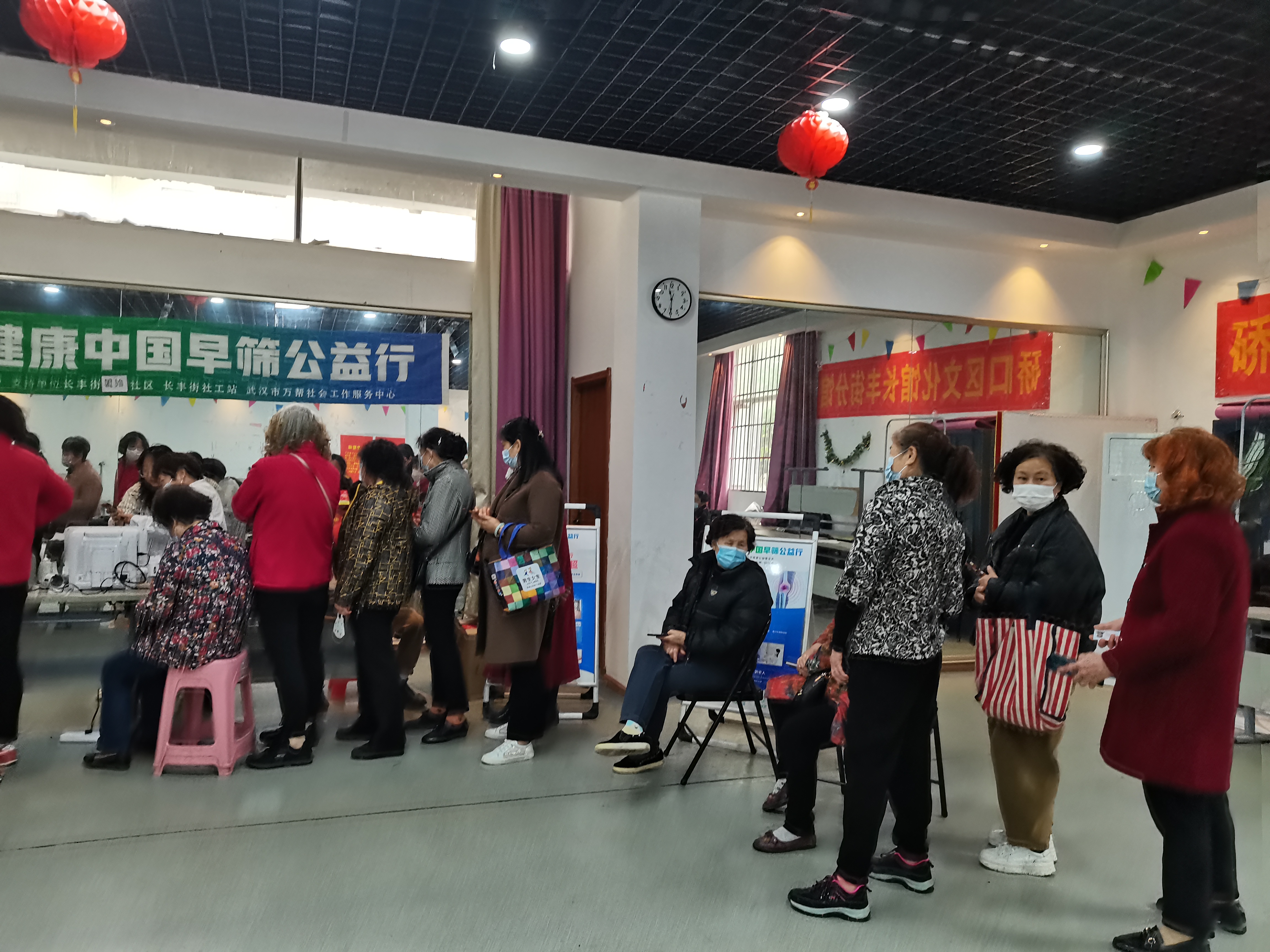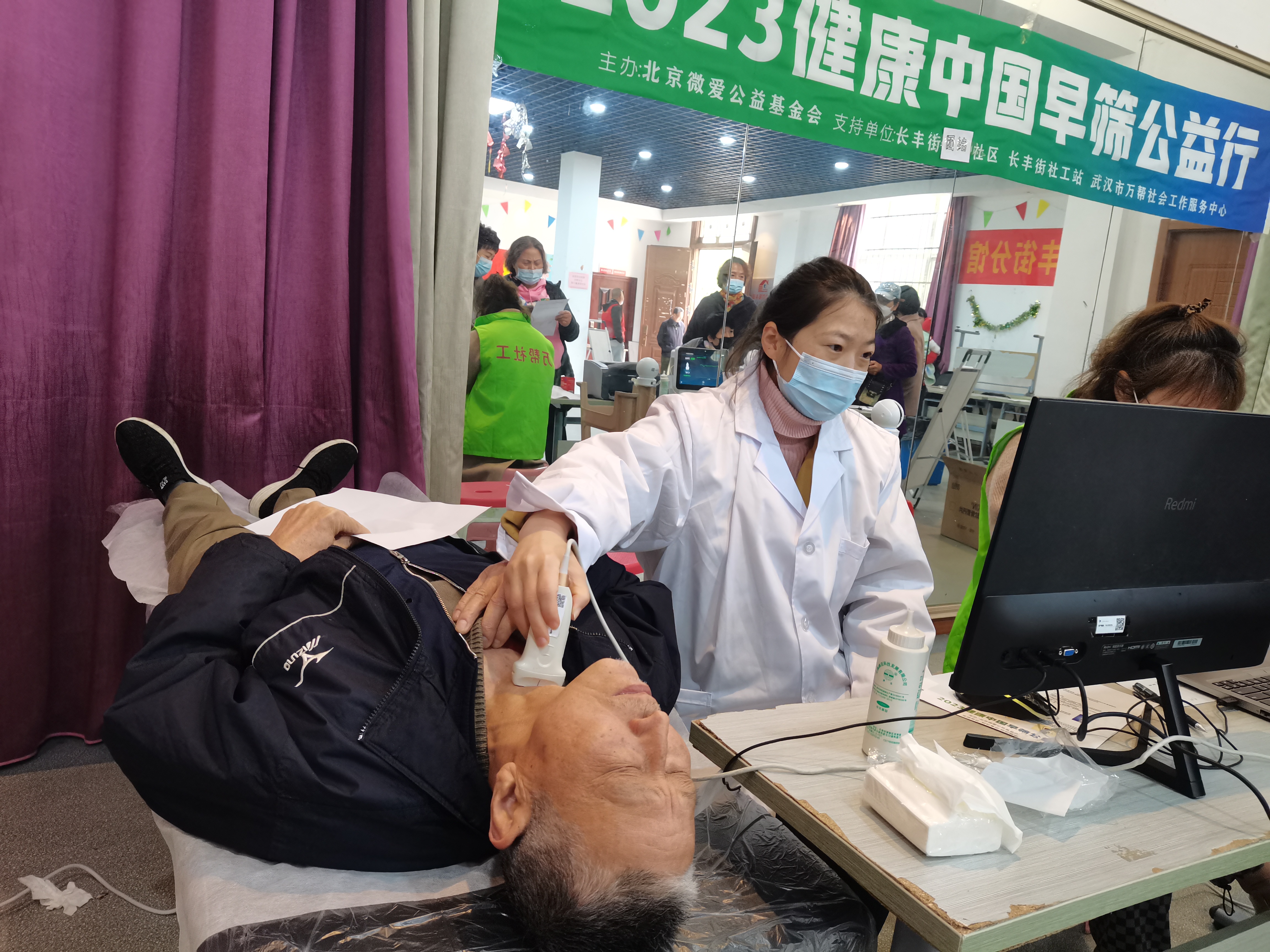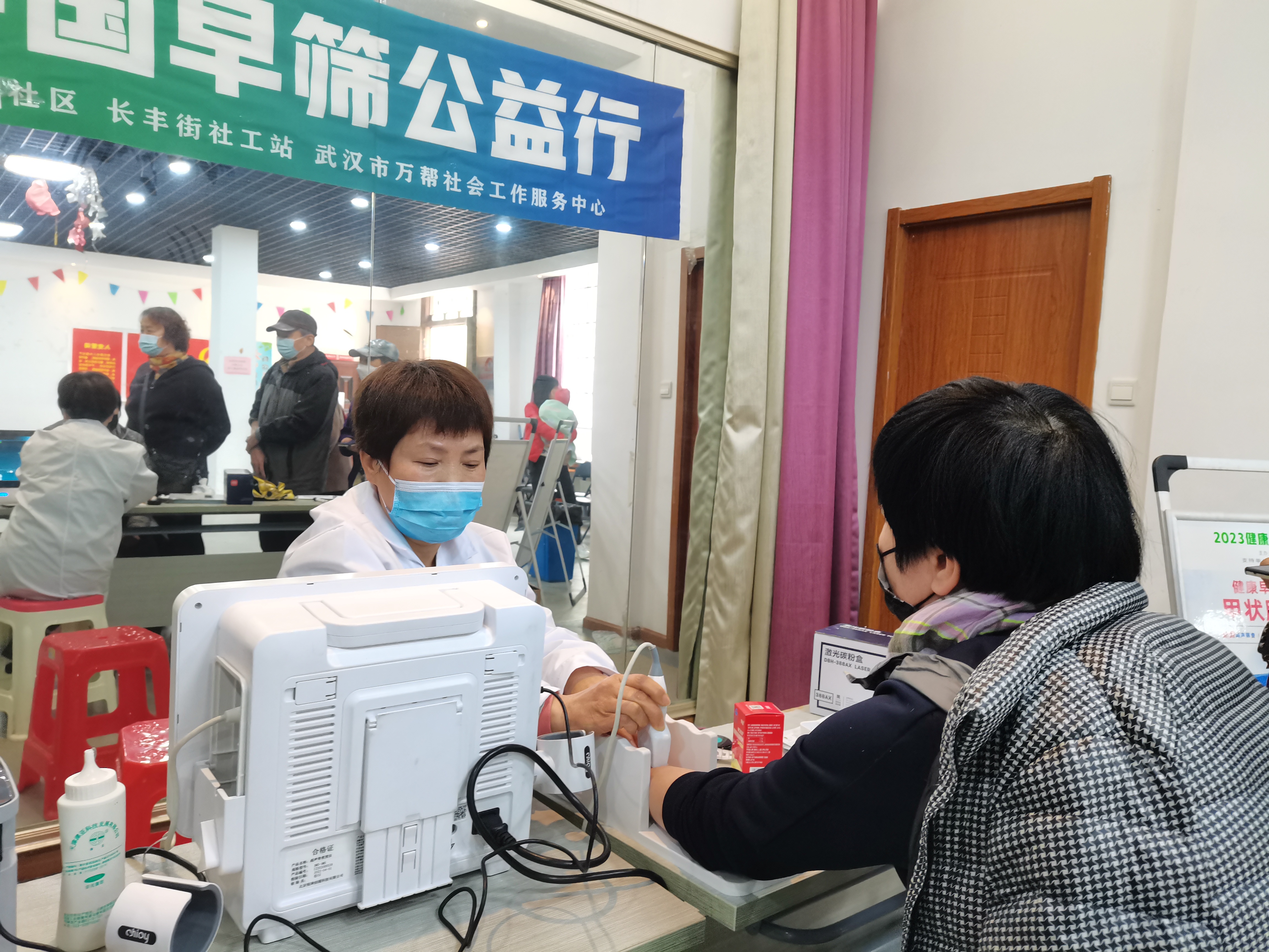 湖北武汉长丰街社工站于2023年年初提出了“健康保护伞”计划,希望在“健康中国”战略下,通过“健康早筛”系列活动提高居民疾病预防意识,同时培养一批优秀的志愿者。4月6日,该计划正式启动,武汉万帮联合团结社区、长丰街社工站、北京微爱公益基金会开展了首场健康早筛活动,近百名社区居民在活动中受益。