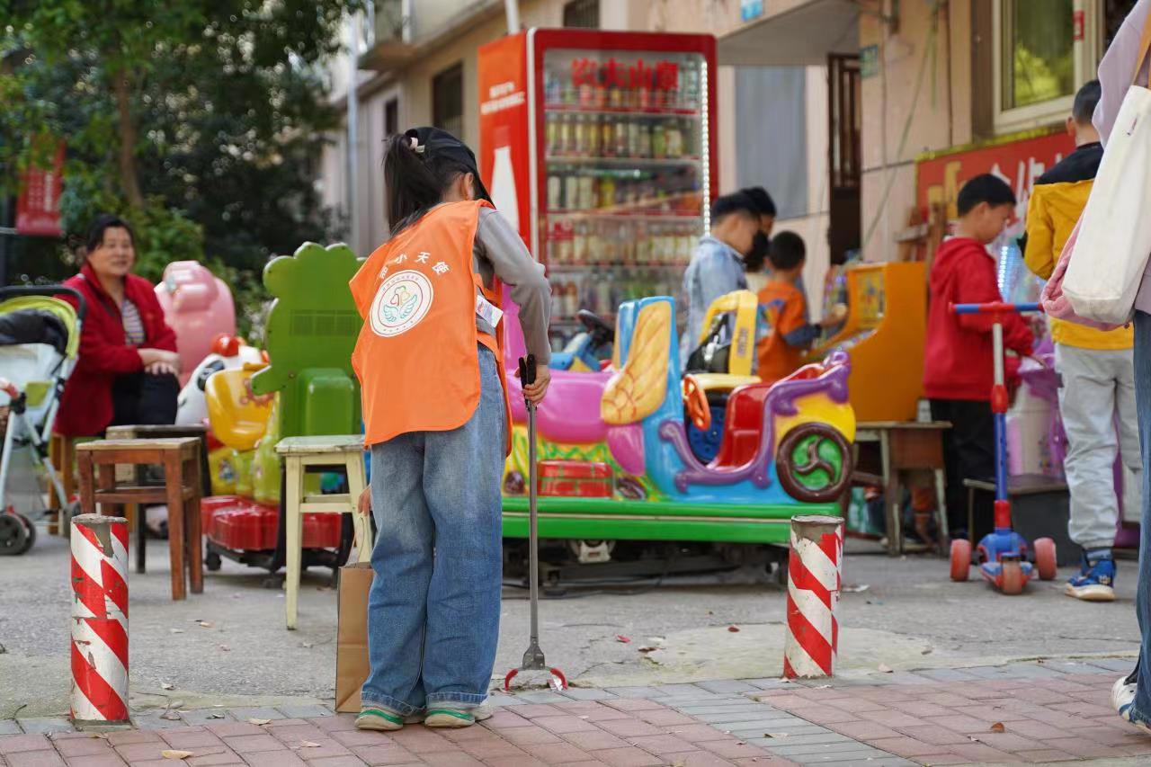 “我志愿成为一名光荣的‘美丽小天使’志愿者”,在社工带领下小朋友们在美丽小天使志愿服务队队旗前庄严宣誓。垃圾夹、垃圾袋,经过培训的美丽小天使们整装待发,“我们出发啦!”,他们穿梭在文化广场上、居民楼间。烟头、纸巾、塑料瓶都是他们要寻找的战利品,不一会儿手上的垃圾袋装的满满的。