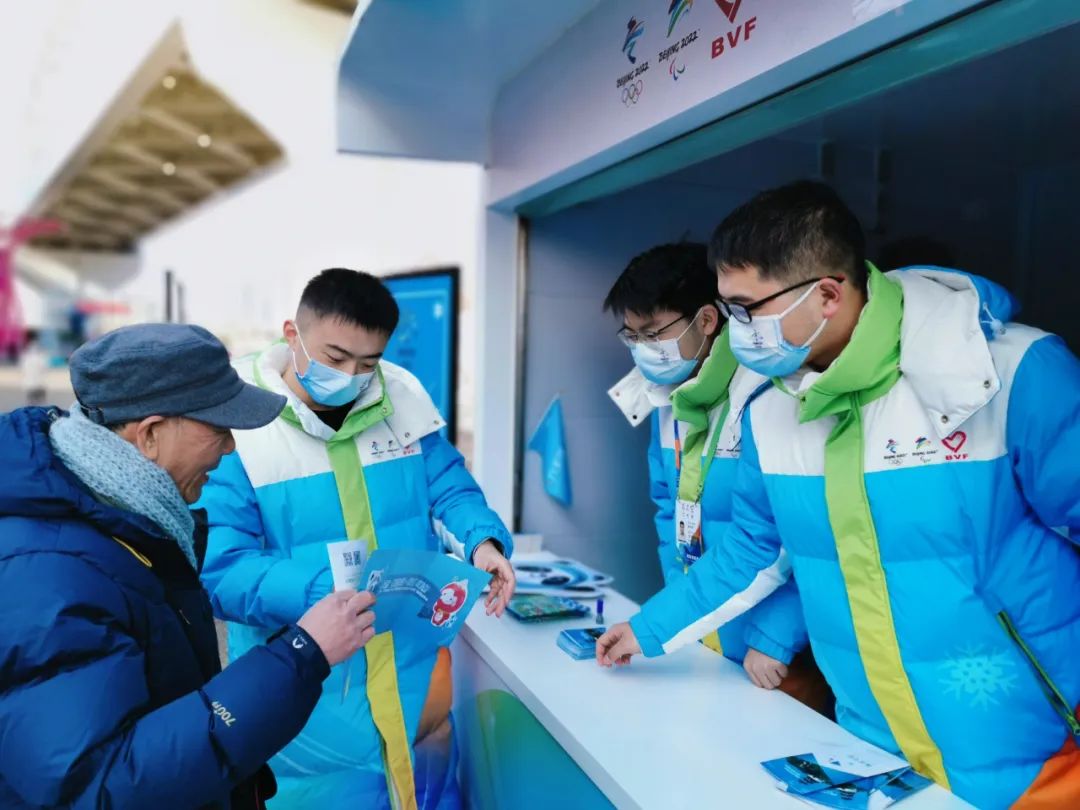冬奥城市志愿服务站点志愿者提供文化宣传服务(北京市志愿服务联合会供图 2022年2月摄)