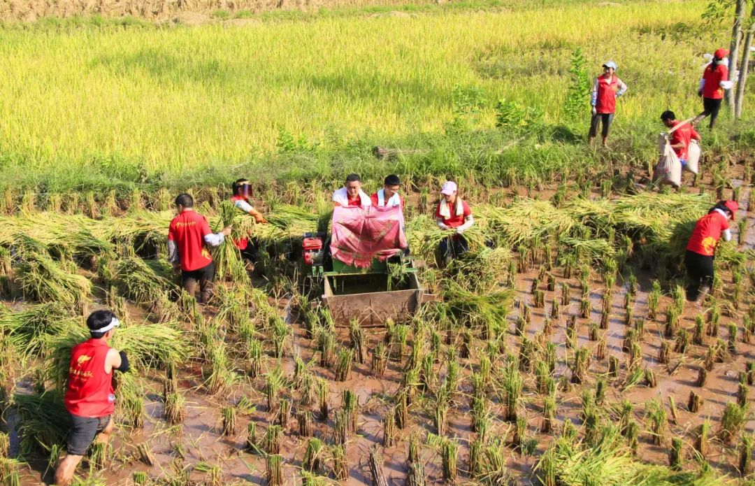 西部计划地方项目——重庆“山茶花”大学生扶贫接力志愿服务行动志愿者帮助贫困户收割稻谷(团重庆市潼南区委供图 2019年8月摄)